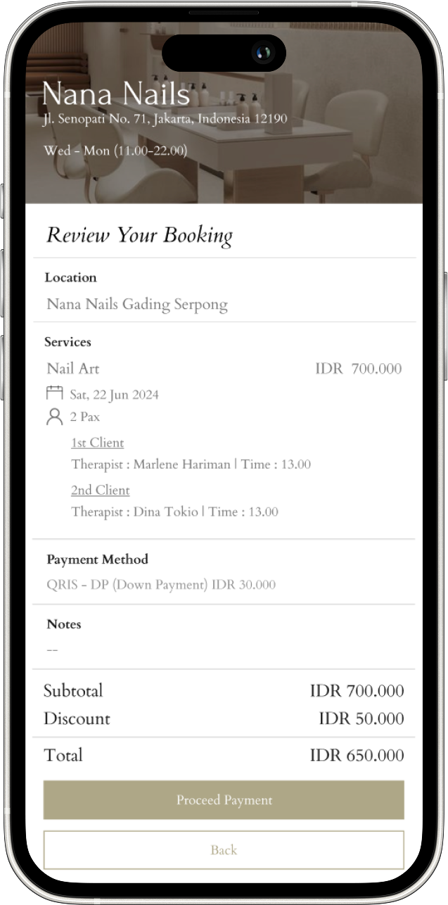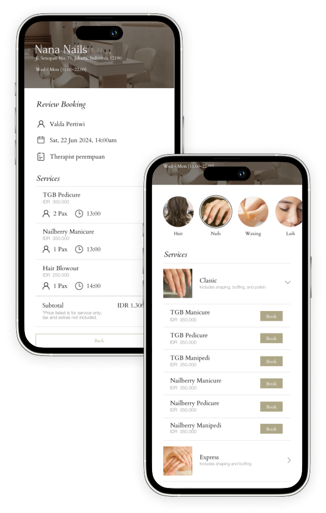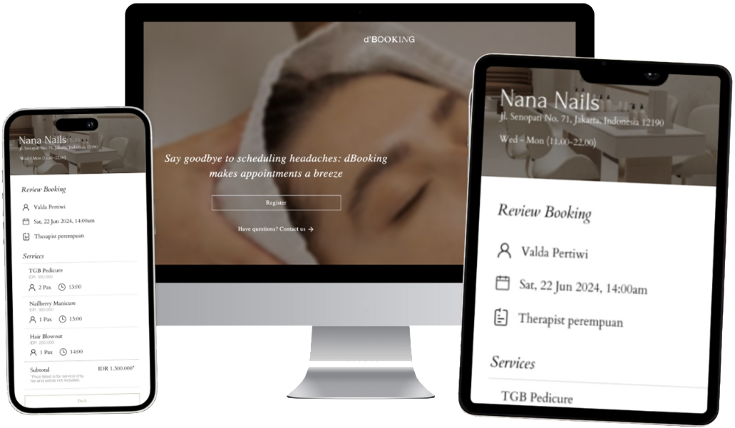 dBooking dirancang untuk menyederhanakan proses reservasi untuk bisnis Anda. Web reservasi ini memungkinkan pelanggan untuk dengan mudah menjadwalkan dan mengelola janji temu secara online, baik untuk layanan salon, reflexologi dan usaha di beauty industry lainnya.